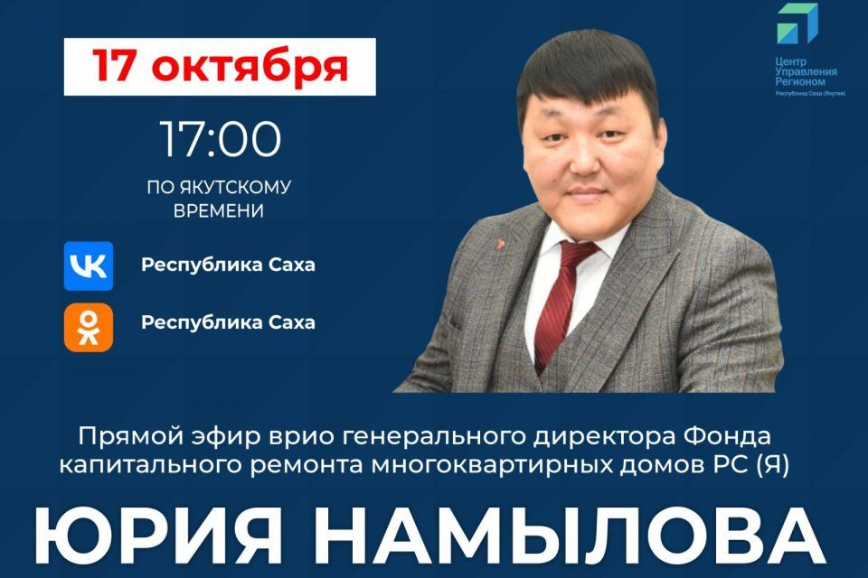 Во вторник, 17 октября, якутянам расскажут о проведении капремонта отопительной системы многоквартирных домов в прямом эфире соцсетей. Эфир проведет временно исполняющий обязанности генерального директора Фонда капитального ремонта Юрий Намылов.