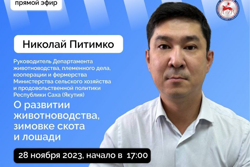 Во вторник, 28 ноября, прямой эфир в социальных сетях проведет руководитель департамента животноводства, племенного дела, кооперации и фермерства Министерства сельского хозяйства и продовольственной политики Якутии Николай Питимко. Об этом сообщает пресс-служба главы и правительства республики.