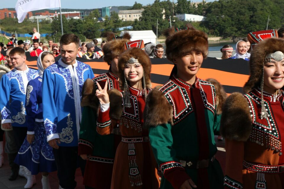 Делегация Якутии приняла участие в торжественном шествии с 80-метровой георгиевской лентой по набережной ДВФУ. В колонне объединились представители регионов Дальнего Востока, военнослужащие, юнармейцы и волонтеры. Мероприятие провели в рамках открытия выставки «Улица Дальнего Востока».