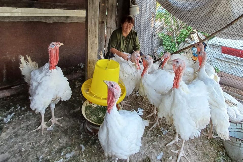 Сегодня хозяйка ухаживает за тремя черными индейками породы бронза, которые вырастают до 10 кг, 11 индейками породы хайбрид конвектор – это тяжеловесы своего вида: самцы могут вырасти до 25 кг, а самки — до 19 кг. Также в хозяйстве есть четыре подсадные утки, куры-скороспелки породы бройлер.