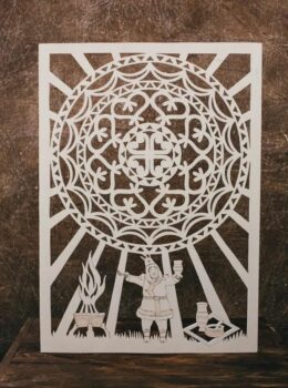 В прошлом году земляки сняли ролик о моем творчестве, предложив отправить одну из работ в музей Солнца. Сразу поняла, какая тема будет отображена в моей работе — солнце и огонь. С глубокой древности саха поклоняются небесному светилу как прародителю, считая себя детьми белого Солнца. Обряд поклонения начинается с первыми лучами, а перед этим происходит обязательный обряд очищения через огонь«, — рассказала мастерица.