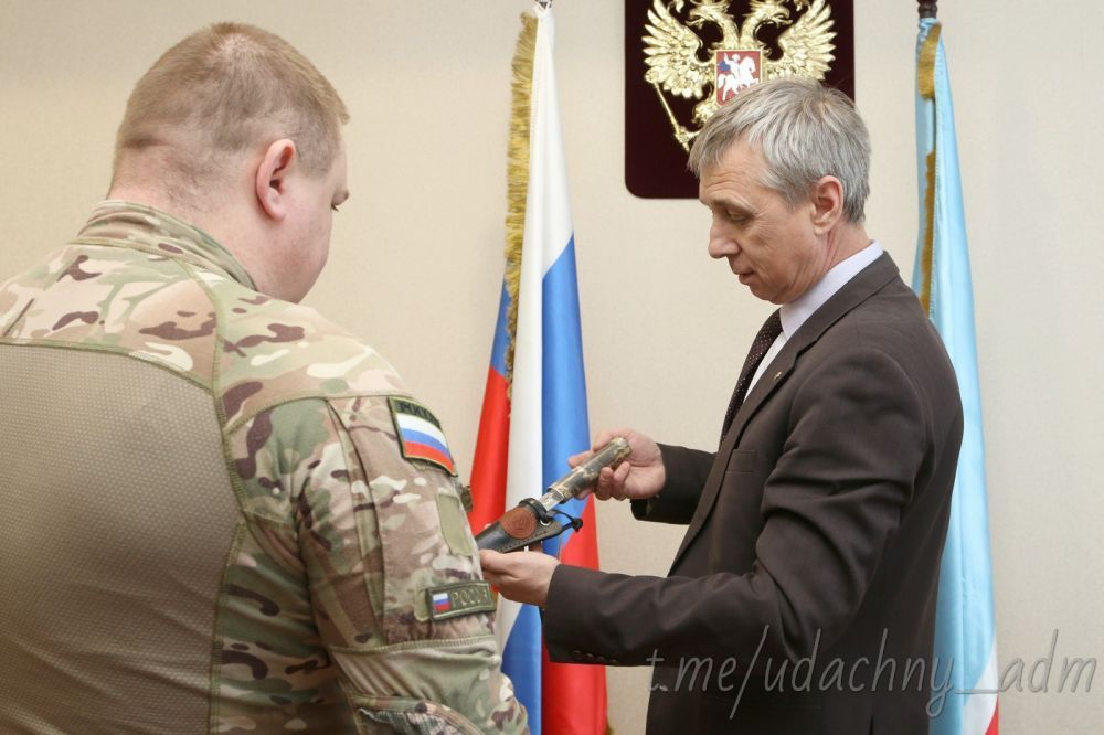 Встречаясь с бойцами, глава города Удачного первым делом узнает потребности парней, какие спецсредства необходимы им «за ленточкой», что поможет спасти и сохранить жизнь нашим героям. И уже традиционно Артур Приходько со словами благодарности вручает военнослужащим якутский оберег – клинок с памятной гравировкой от Главы Республики Саха (Якутия) Айсена Николаева.
