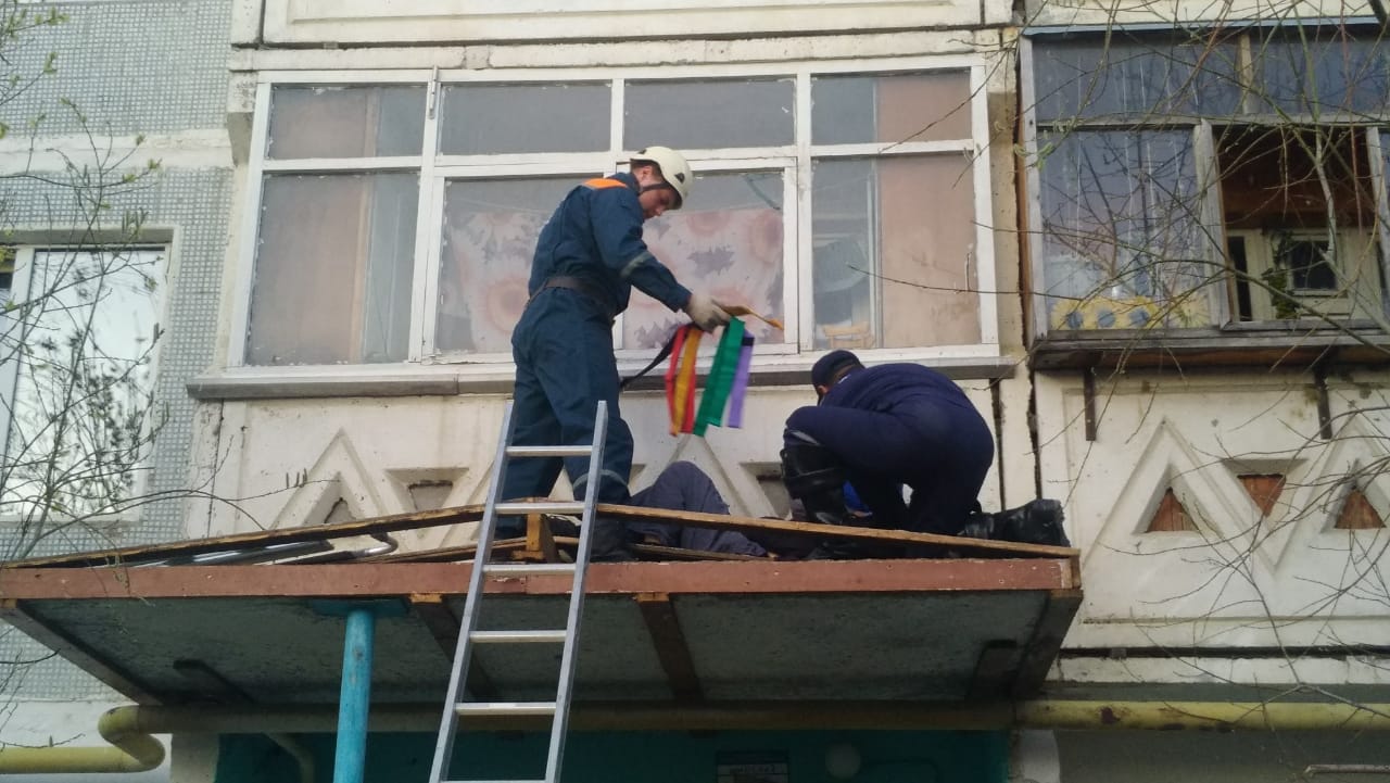 Дежурная смена выехала к месту происшествия. Поднявшись на козырёк по лестнице спасатели осмотрели пострадавшего, им на помощь поднялся врач скорой помощи и оказал первую необходимую помощь.