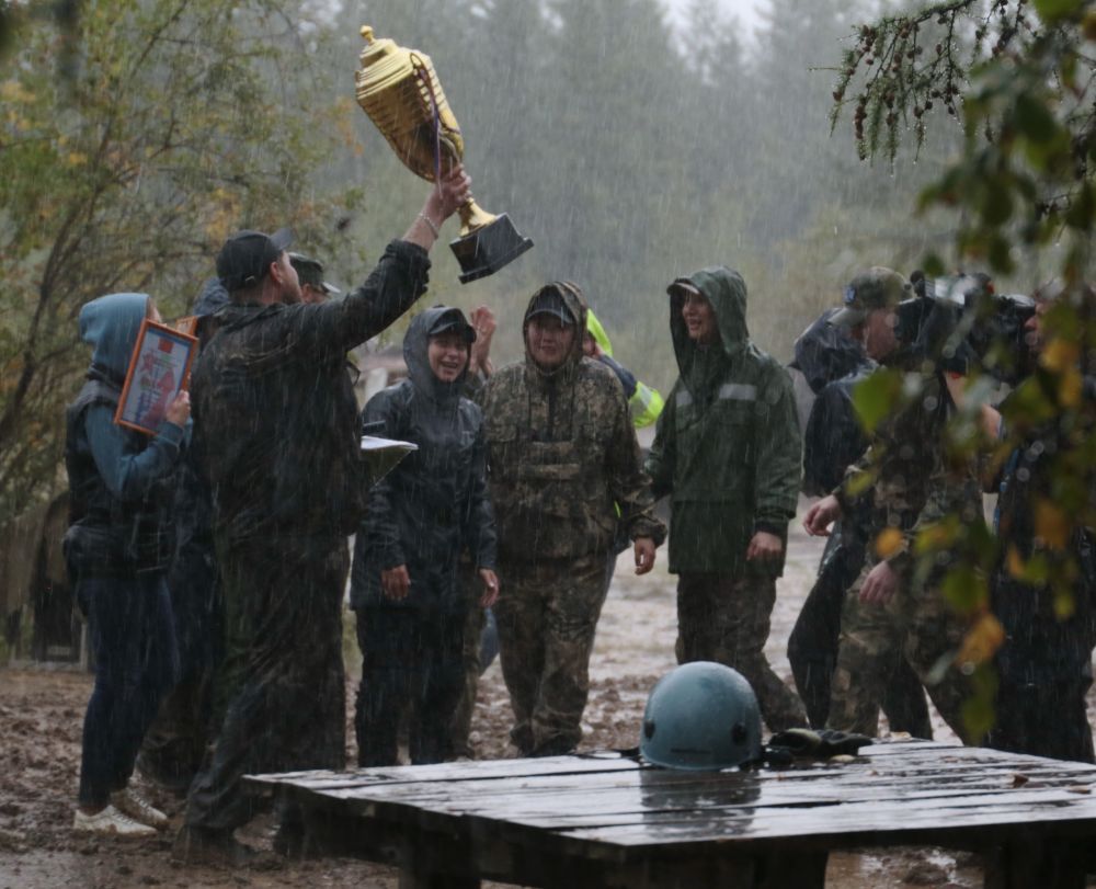 Здесь на «переправах» нужно демонстрировать навыки опытного туриста-скалолаза. Потом отвечаем на вопросы по тактической медицине. Снаряжаем магазин патронами, проходим по «минному полю», стреляем из гранатомета, метаем гранаты, «теряемся» на местности и поражаем мишени из пневматической винтовки. Стоит отметить, что в этом году «бабочку» (пара скрещённых тросов, натянутых между деревьями и изображающими переправу) команды проходили вполне буднично. Неожиданно сложно оказалось стрелять по мишеням. Три команды подряд ушли с рубежа «сухими». В этом году опытная команда МРУО (победитель эстафеты 2022 года) стала «бронзовым» призером. Спортсмены КСК пришли вторыми. А первенствовали в этом году дебютанты - ребята из поселка Светлый. Последнее слово в этот день осталось…за ливнем. Не успели учредители приступить к процессу награждении, как на полигон обрушились потоки воды. И Кубок светлинцам и.о. председателя РКМ Мирнинского района Иван Беляев вручал уже под проливным дождем. Впрочем, победителям это настроения не испортило.