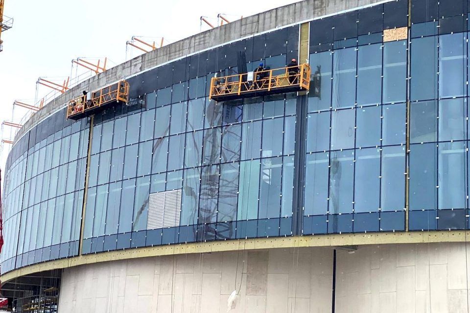 Монолитный каркас здания общей площадью 33 тыс. кв. метров обрамлён светопрозрачными конструкциями по всему периметру. Площадь фасада составляет 7,5 тыс. кв. м, из них 6,3 тыс. кв. м занимают около 2000 смонтированных стеклопакетов. В ближайшее время начнётся подъём символических урас на крышу комплекса. Работы будут выполнены с помощью гусеничного крана грузоподъёмностью 280 тонн и стрелой высотой 80 метров. С его же помощью уже установлен металлокаркас «стеклянного озера».