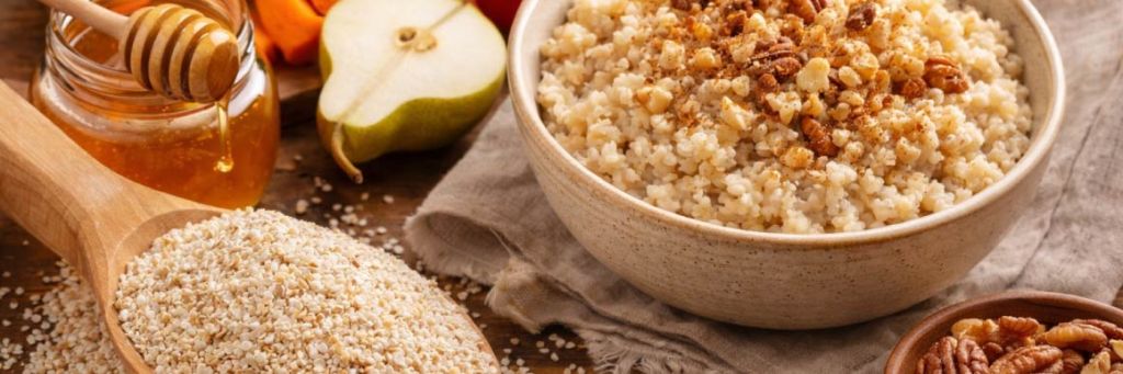 Ингредиенты: 1 стакан ячневой крупы, 2 стакана молока (или вода + молоко), 1 спелая груша, 1 ч. л. меда, щепотка корицы, горсть орехов.